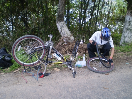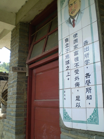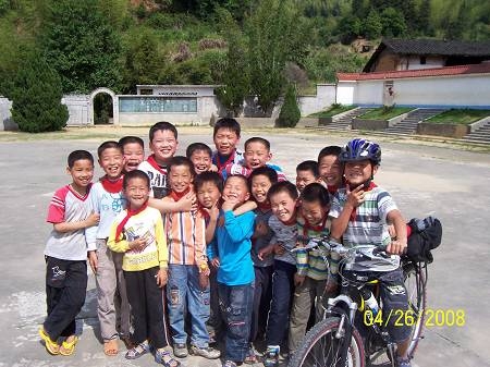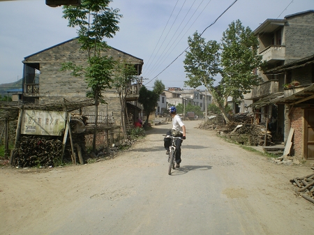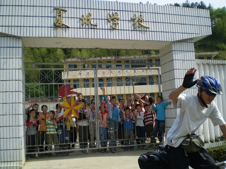 这里四周都是山,进了村,我和随行的记者很引人注意,路上的村民都向我们投来好奇的目光,大概在他们眼里就是这样一副场景:一个人在前面狂骑,后面一辆汽车狂追,里面还有人举着摄像机在拍,搞不清楚这是怎么一回事。越向村里面走,越感觉这是一个比较落后的村子,土砖砌的房屋,凹凸不平的土路,路旁杂草丛生,家家户户门前凌乱堆放着木材。这时候,传来了朗朗的读书声,一所破旧的学校进入了我们的视线——夏坑学校。