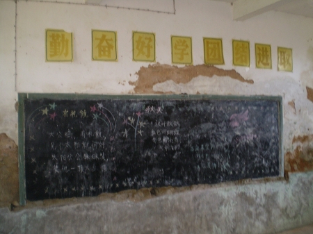通过交谈,我们了解到,这是一所希望小学,学校一共有154人,从幼儿园到六年级的学生,都是周边村子的孩子,教学设备非常的少。现在有两个“校区”,之所以叫做校区,也只是为了区分新旧校舍。老校区是一所面积不是很大的院子,现在主要用来堆放杂物,只有一个班的学生还在上课,两层楼的教学楼已经破旧不堪,教室内墙皮已经大面积脱落,一块木板刷上黑漆便成了黑板,教室的窗户也都打着补丁。一大片空地就是他们的操场,操场上唯一一个体育器材——简易的乒乓球台子,两块砖头架起一根竹子便是球网。新校区是一个三层的教学楼,全部是由社会资助盖起来的,2000年盖了第一层,2003年盖了第二层,2006年才把第三层盖成。