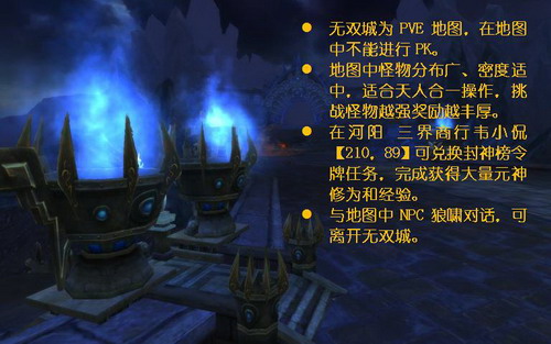 无双城——帮派领土争夺的最高战场、跨服PK资格赛拼杀场地……而现在,众多玩家又将在这里接受全新的历练与考验!全新无双城将对封神玩家全面开放,元神修为、角色经验、造化珠、各类奇珍都能在这里获取,配合封神榜任务,是一条安全稳定的封神修炼之地。进入条件:封神角色进入NPC:河阳狼战【1