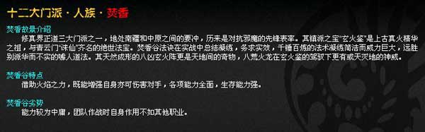 修真界正道三大门派之一,地处南疆和中原之间的要冲,历来是对抗邪魔的先锋表率。其镇派之宝“玄火鉴”是上古真火精华之祖,与青云门“诛仙”齐名的绝世法宝。焚香谷法诀在实战中总结凝练,务求实效,千锤百炼的法术凝练简洁而威力巨大,远胜别派华而不实的噱人道法。其天然成形的八凶玄火阵更是天地间的奇物,八荒火龙在玄火鉴的驾驭下更有或天灭地的神威。