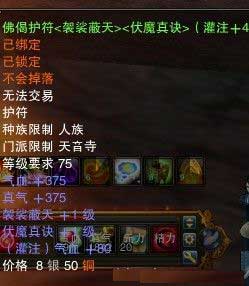 清无敌也是必须的遮天的群降抗我觉的在现在无量疲软的时代的还是需要的,在6道和天地2个输出技能了我选择了天地,因为6道N个蛋疼之处和FB+1的天地以及缺乏的技能点让我选择了天地满的法阵清雷音CD帮助队友提高输出还是不错的,其实我也曾经准备放弃易筋的,但是如果我们超级短腿的魔TY被减速或者被无间这样,那骑坐骑往前按人都会被减速成倒退所以有时候还是需要的。因为群降睡抗,所以袈裟是必须的既然点了袈裟那我顺便走下净世佛心点1点就可以,因为有护符40%CD就够了,第2页比较非主流的是伏魔,不过我可以给大家看个护符: