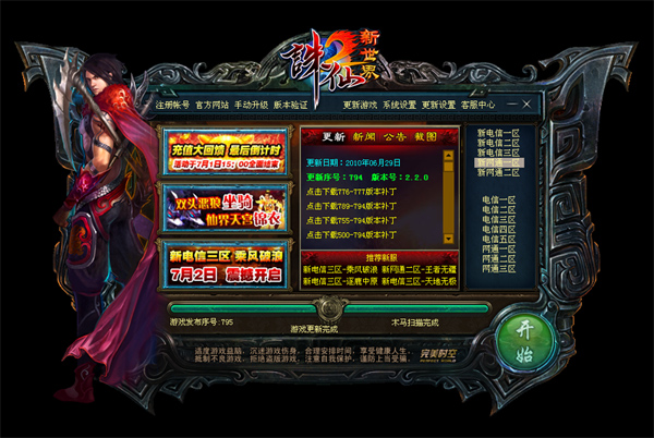 点击界面下方【开始游戏】按钮,登录游戏。在阅读最新的游戏公告后,请选择一个喜欢的服务器,输入游戏账号密码即可开启修真之旅。